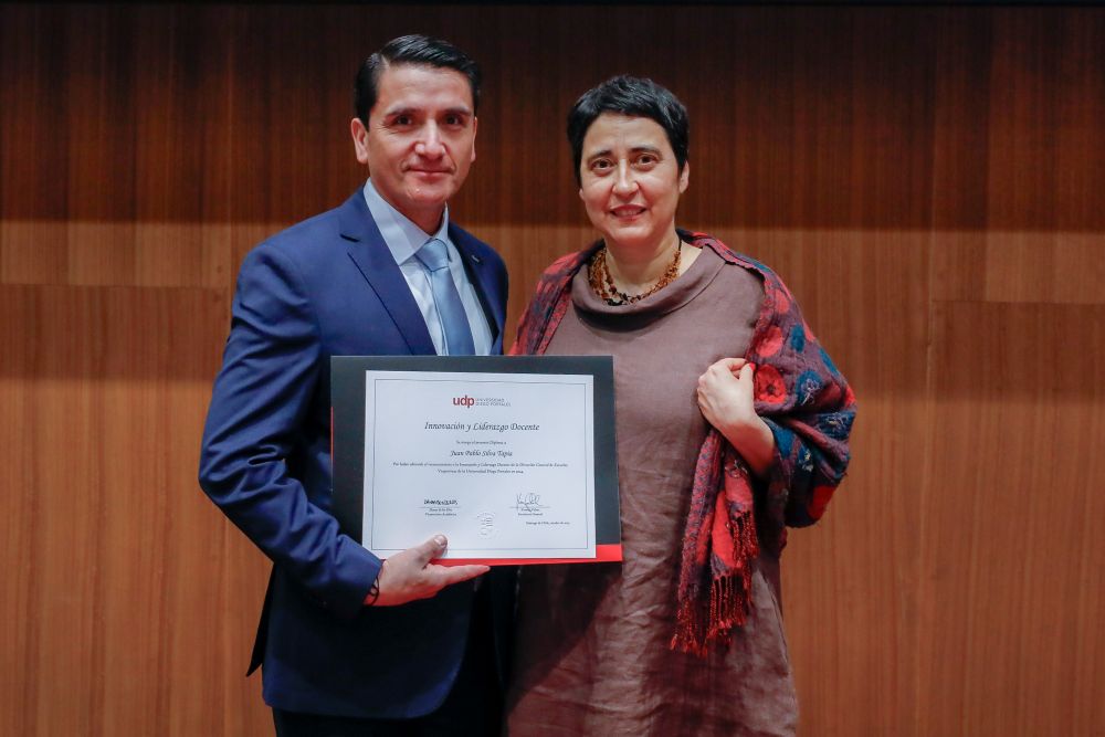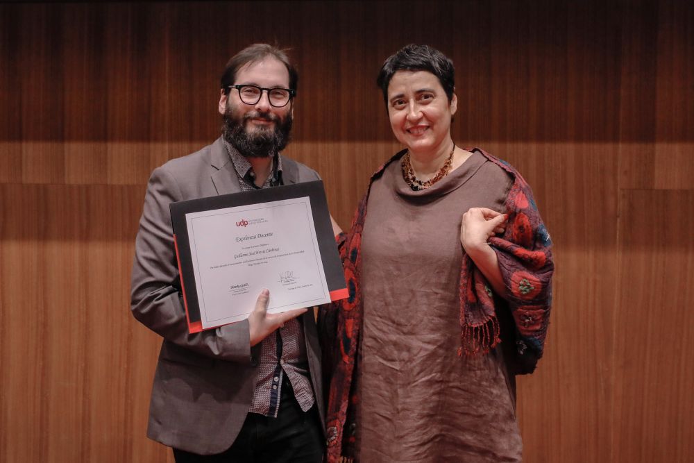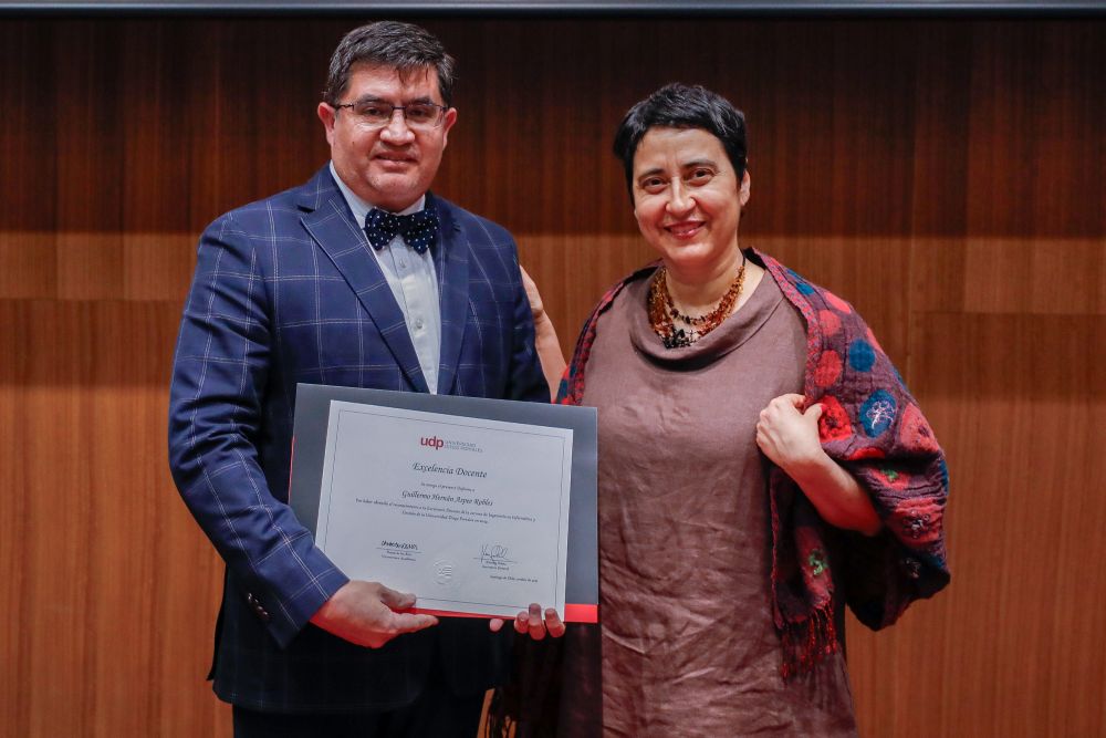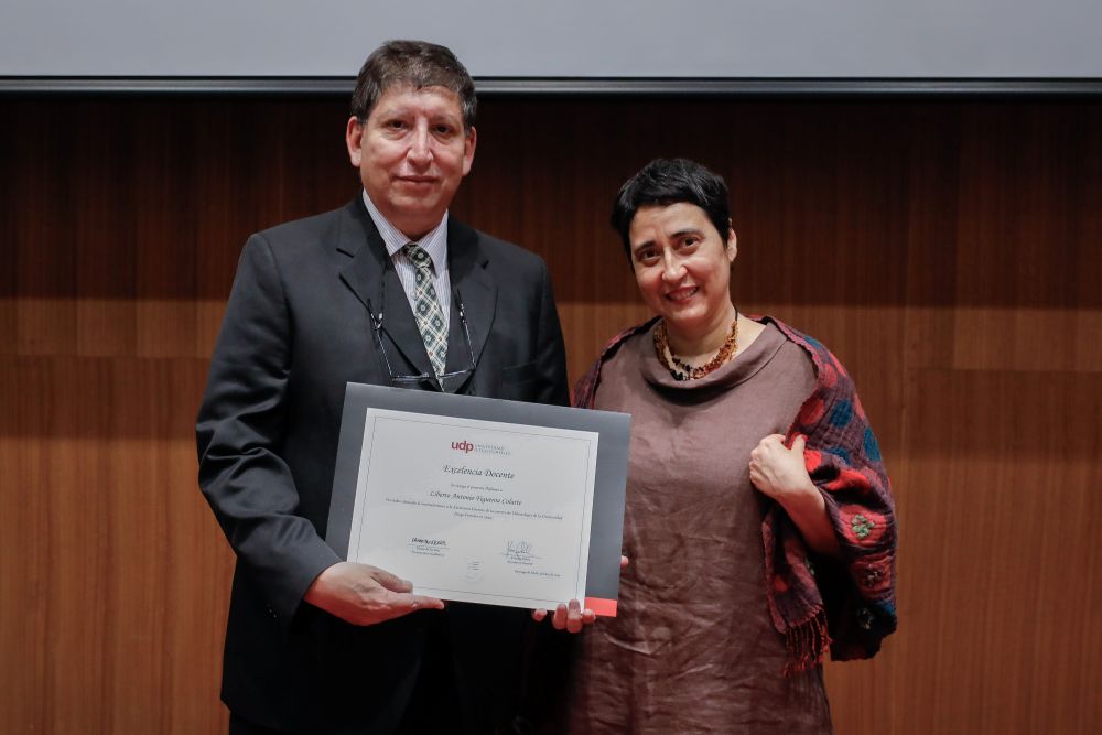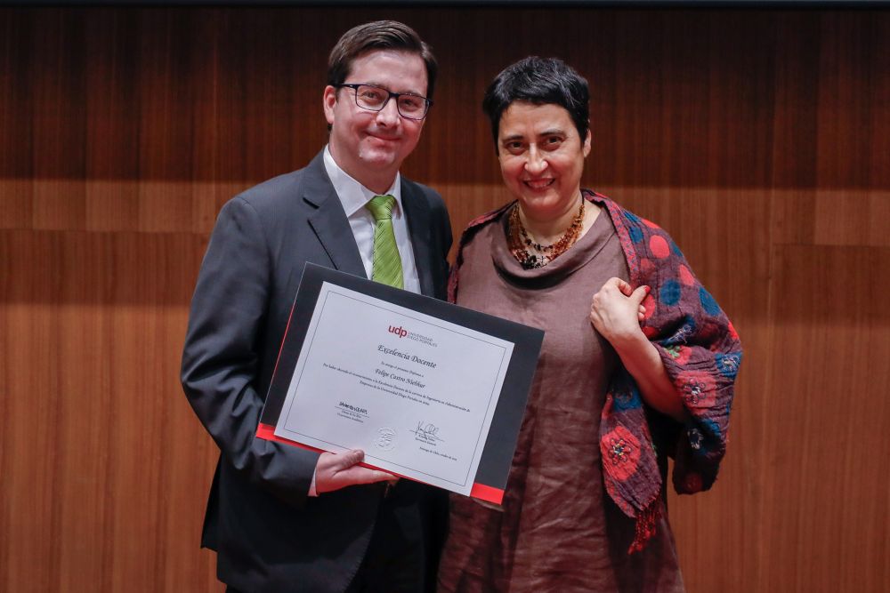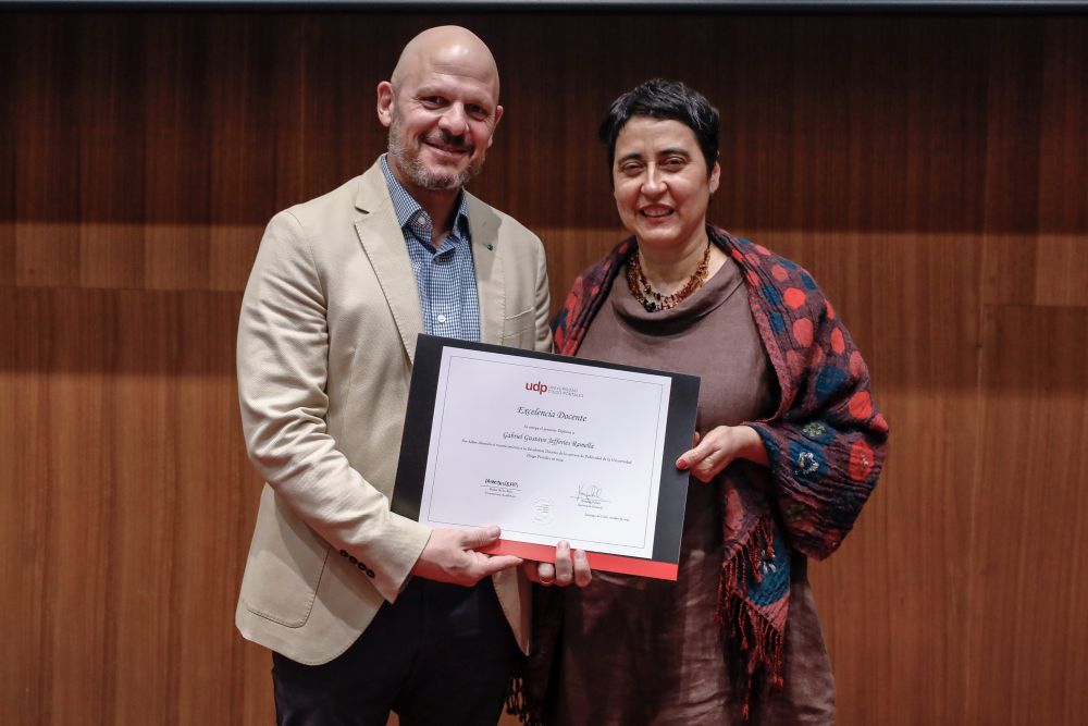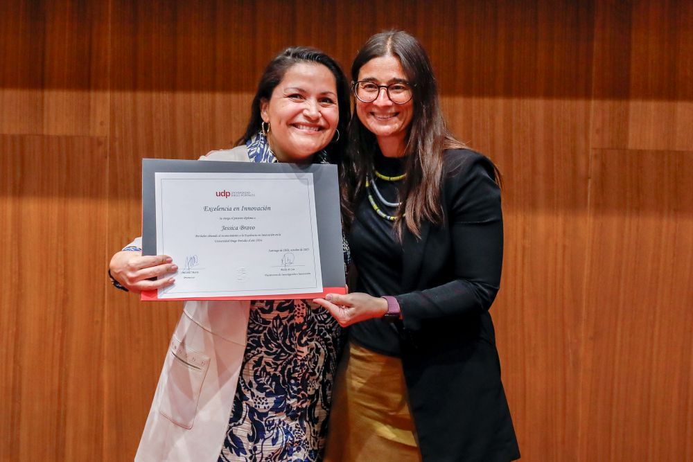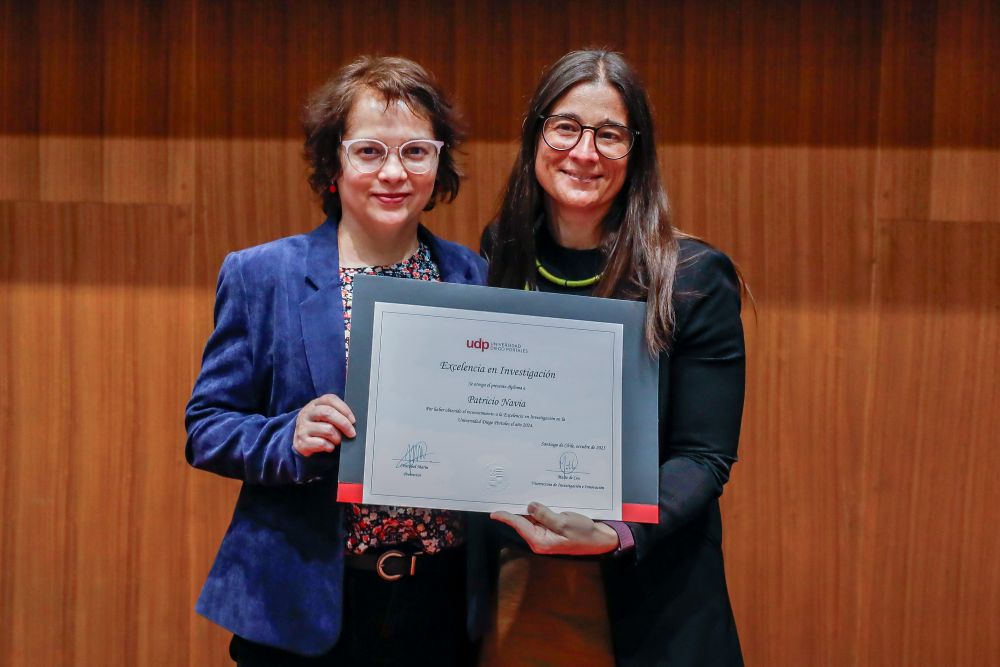 El reconocimiento a la investigación recayó en el académico Patricio Navia, de la Facultad de Ciencias Sociales e Historia, mientras que el premio a la Innovación fue para Jessica Bravo, de la Facultad de Medicina.