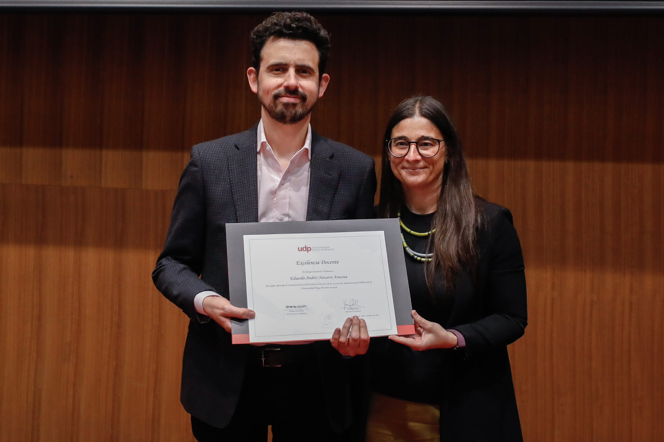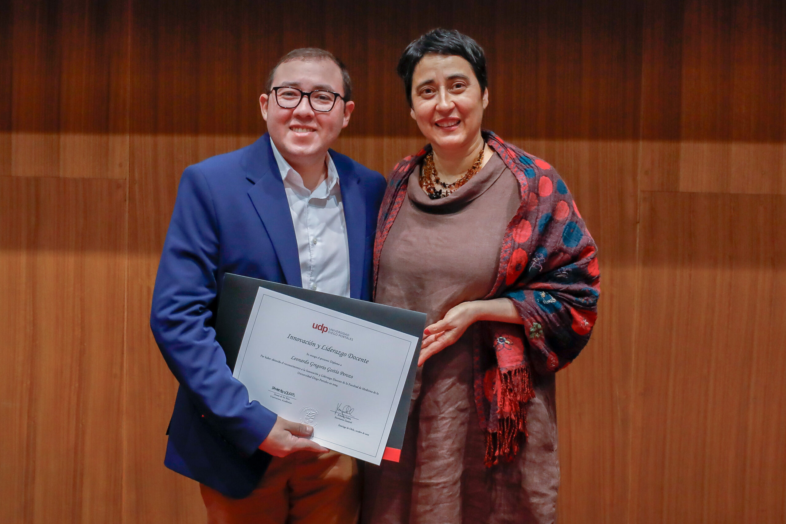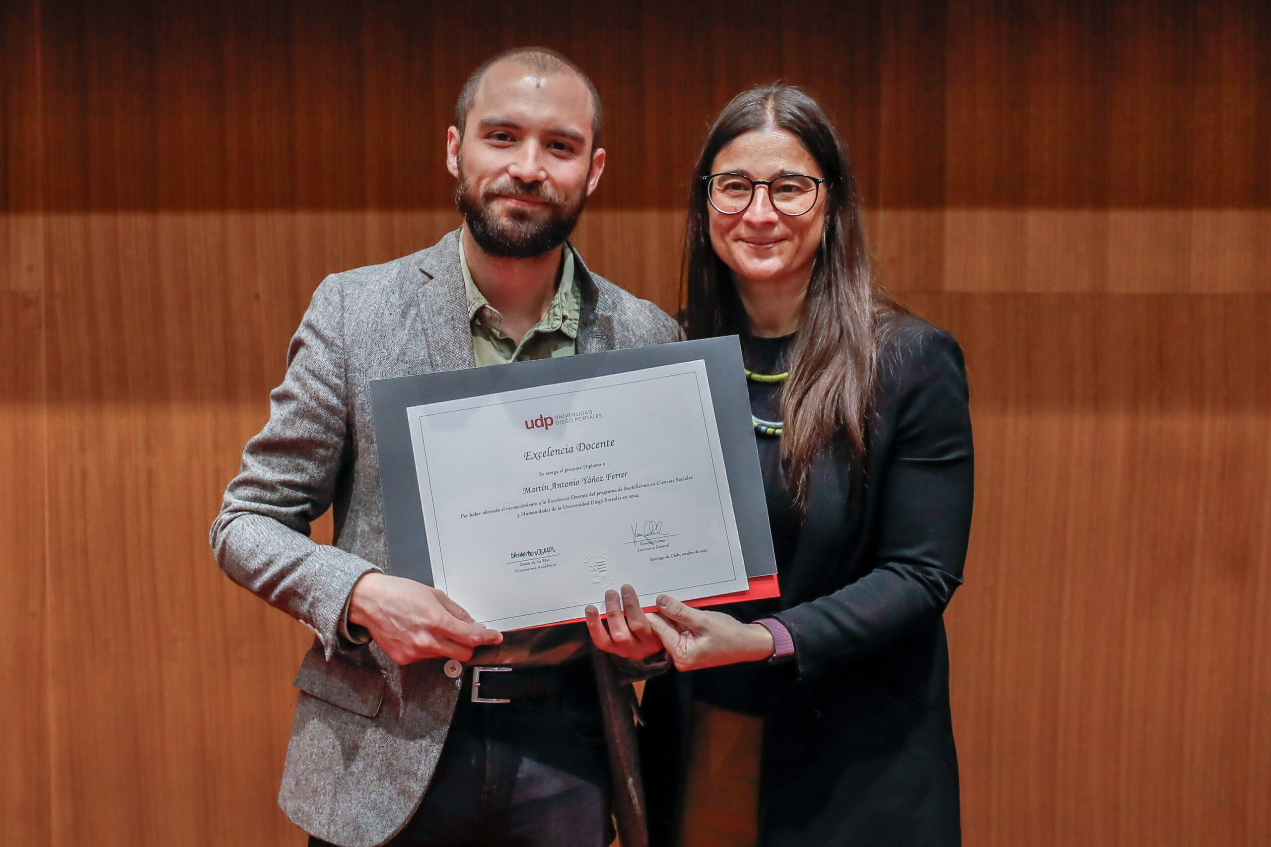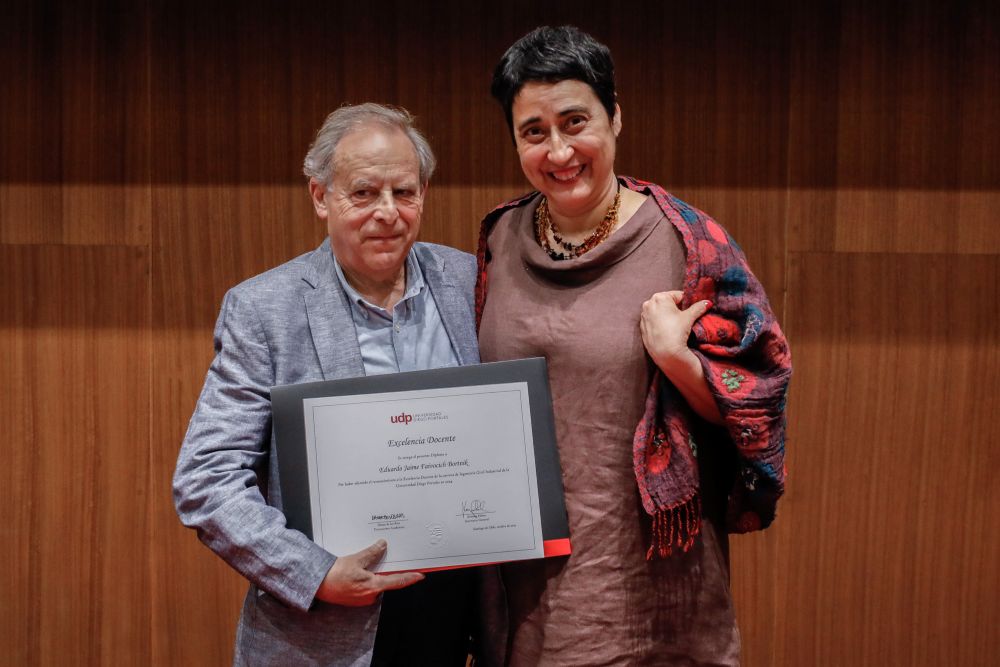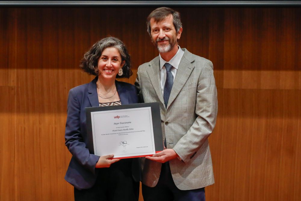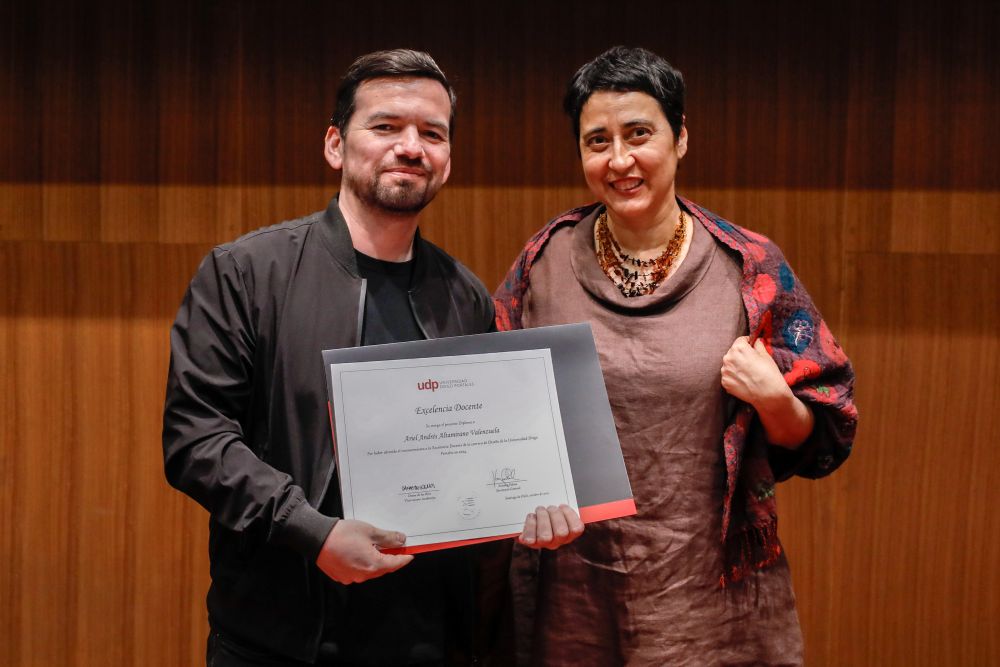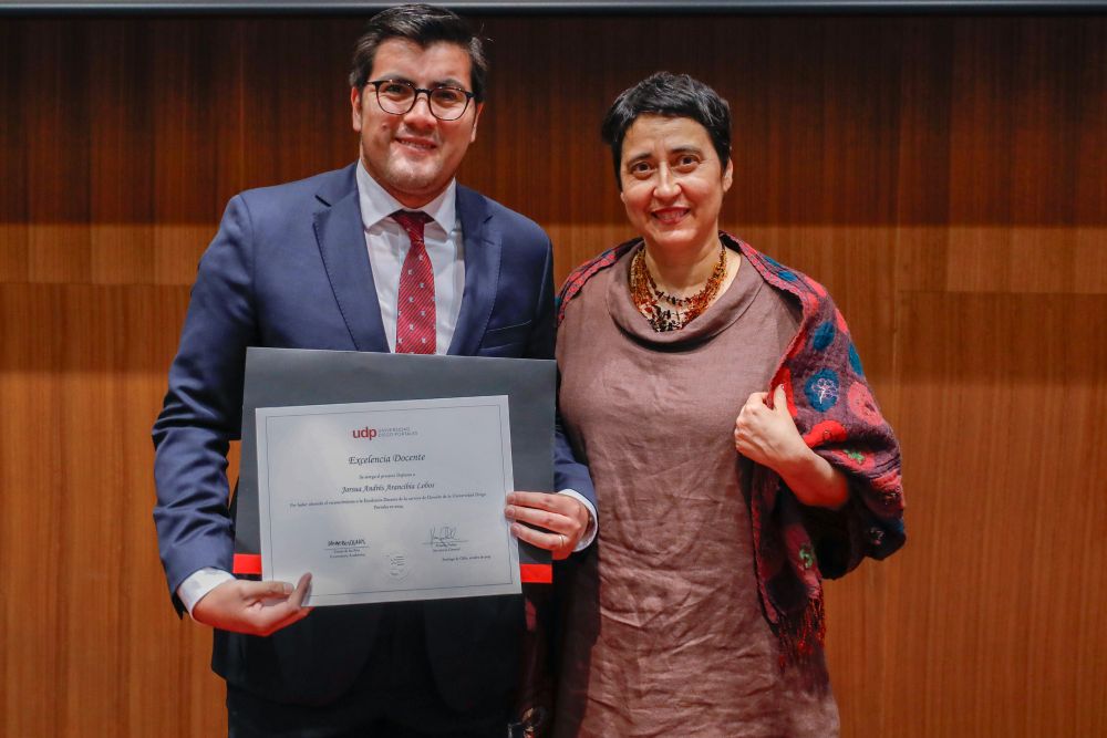 El reconocimiento a la investigación recayó en el académico Patricio Navia, de la Facultad de Ciencias Sociales e Historia, mientras que el premio a la Innovación fue para Jessica Bravo, de la Facultad de Medicina.