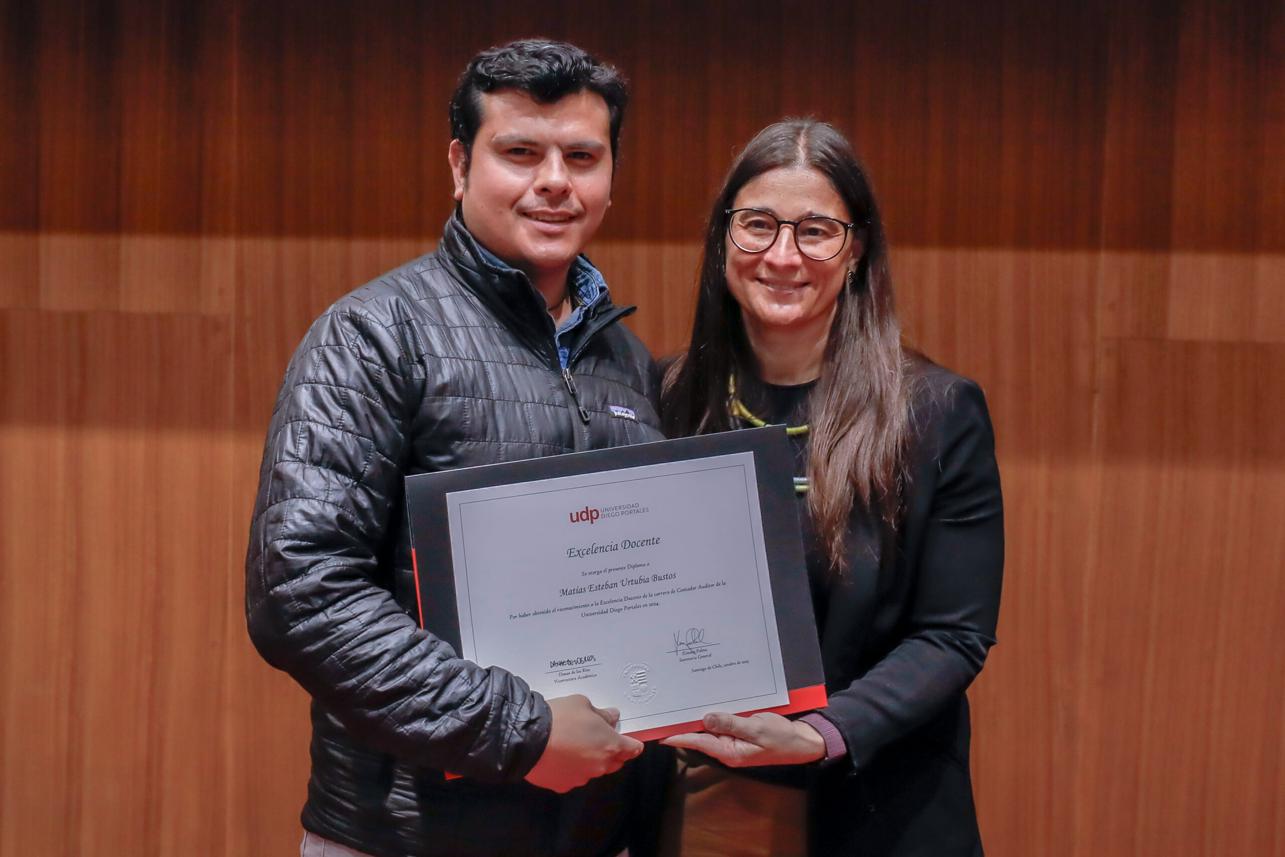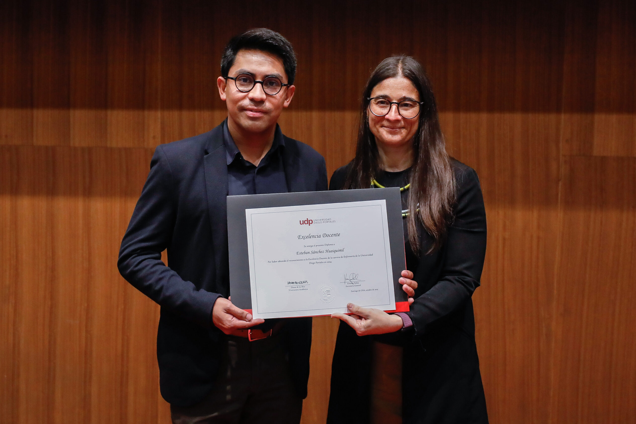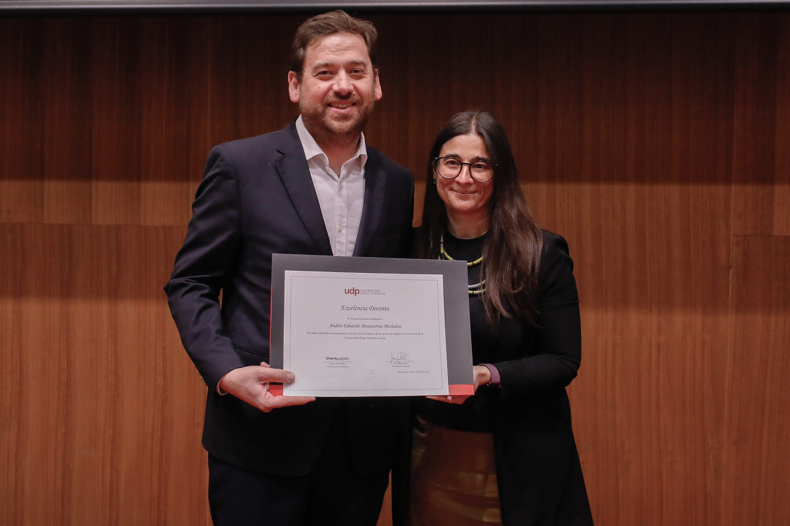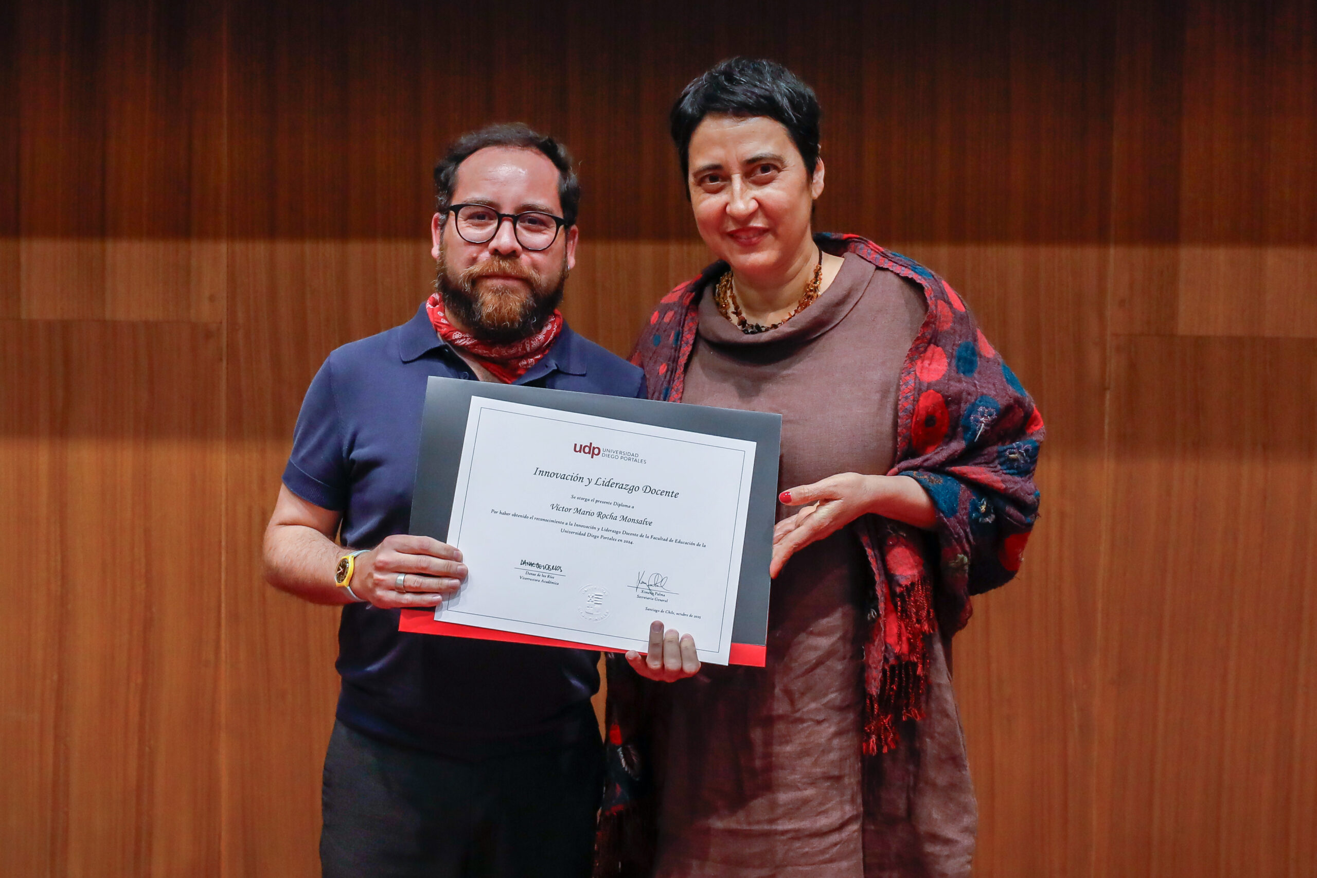El reconocimiento a la investigación recayó en el académico Patricio Navia, de la Facultad de Ciencias Sociales e Historia, mientras que el premio a la Innovación fue para Jessica Bravo, de la Facultad de Medicina.