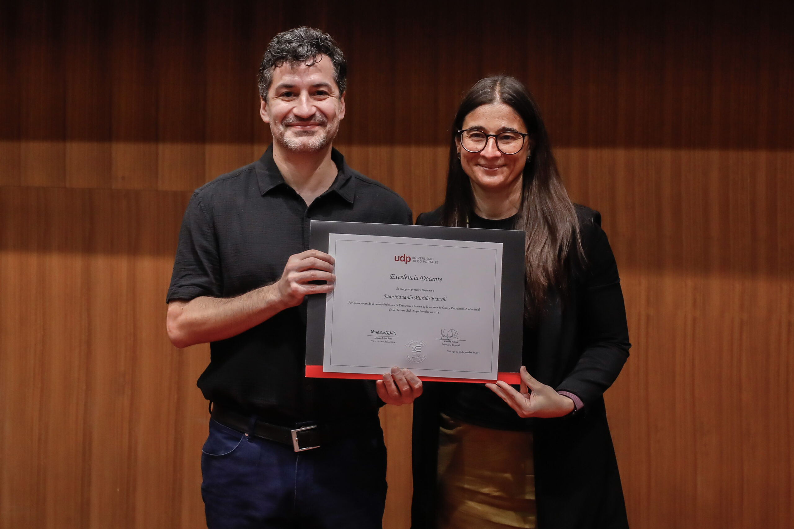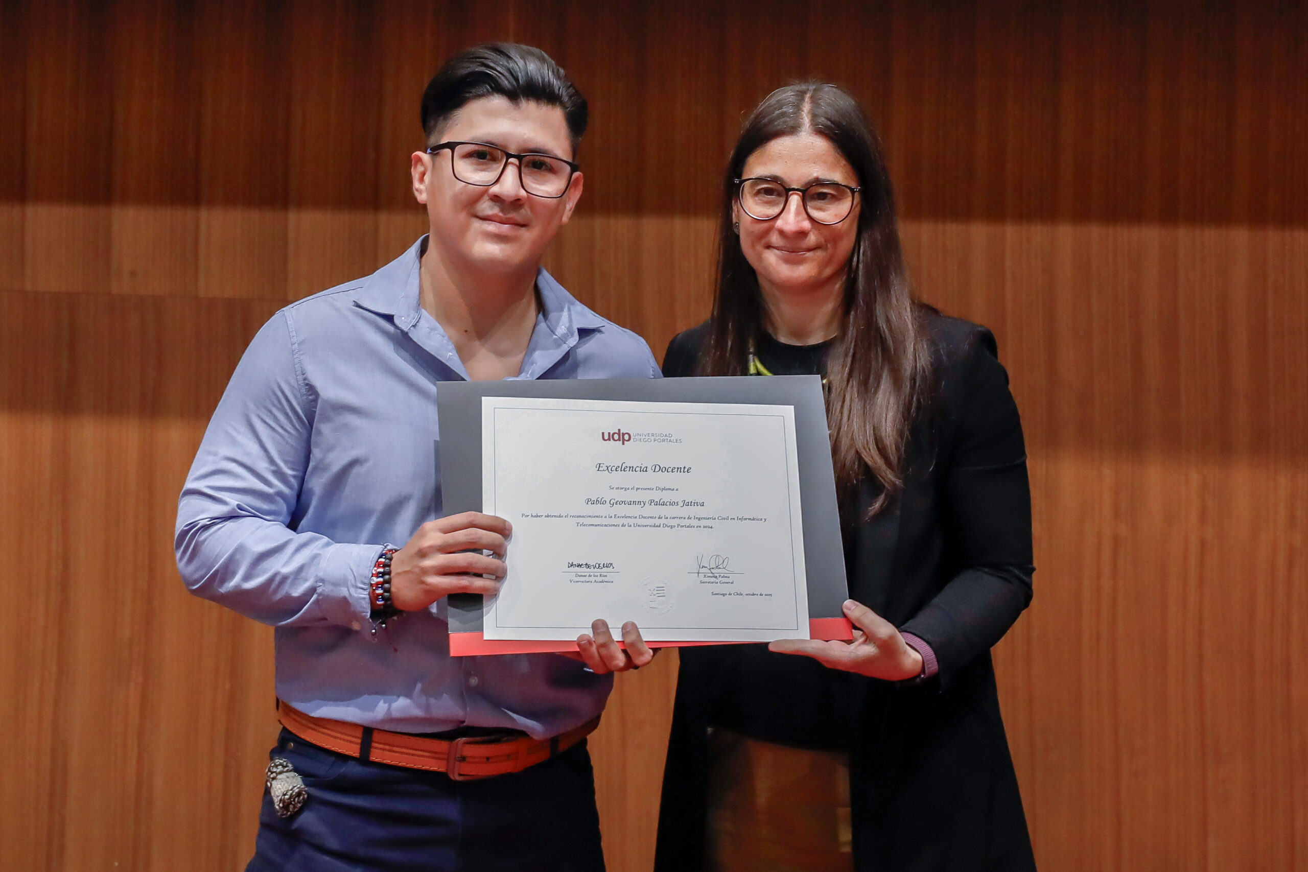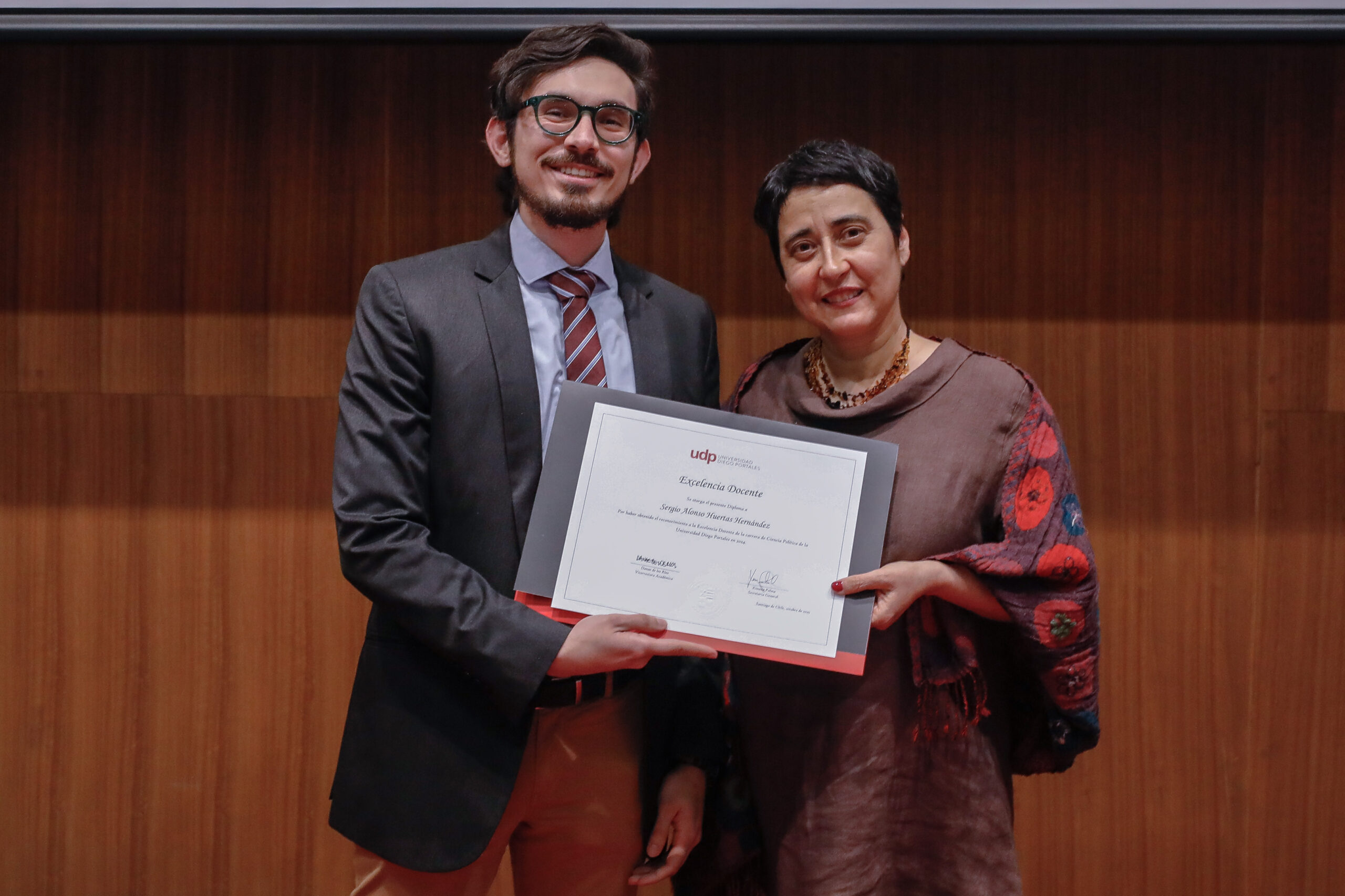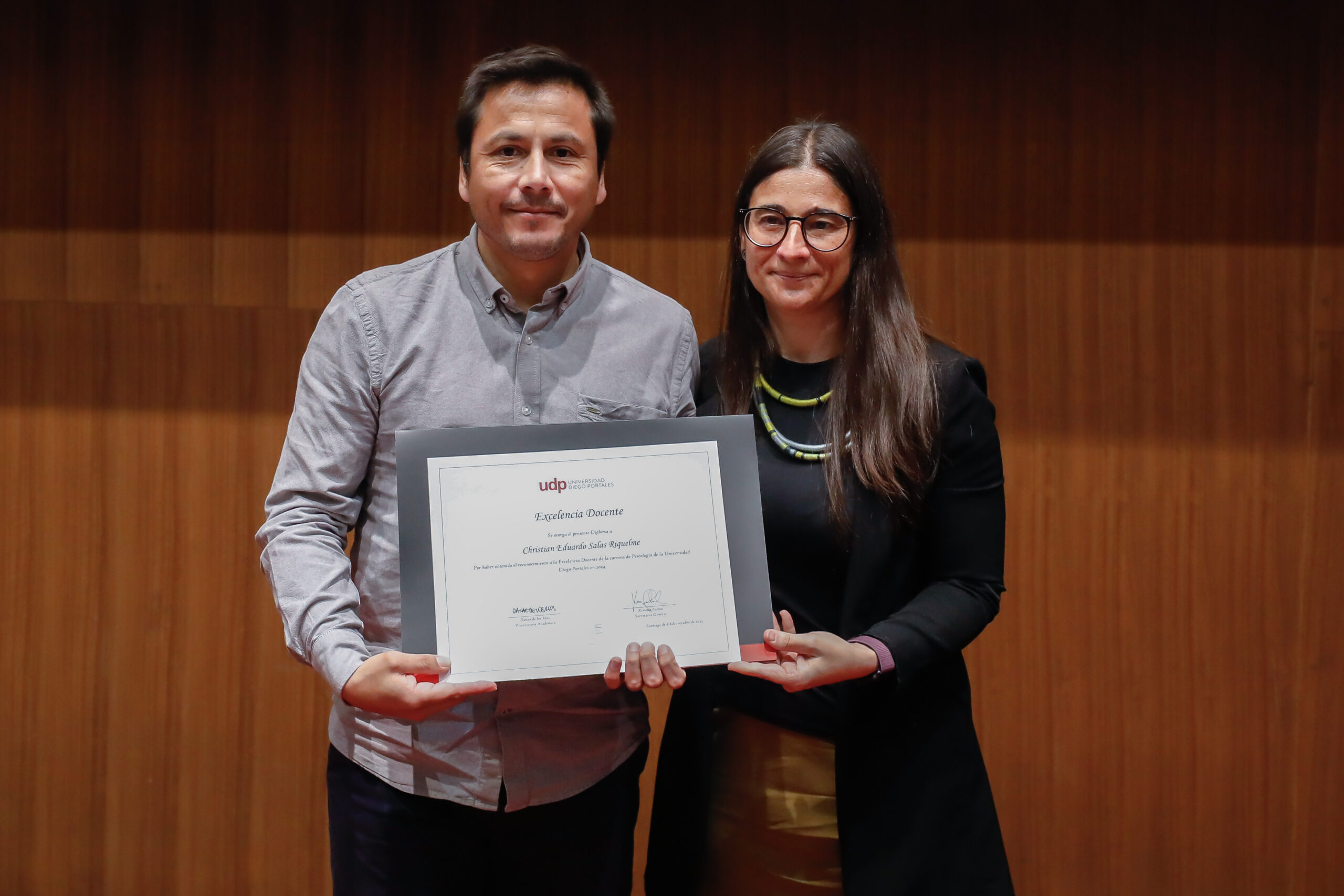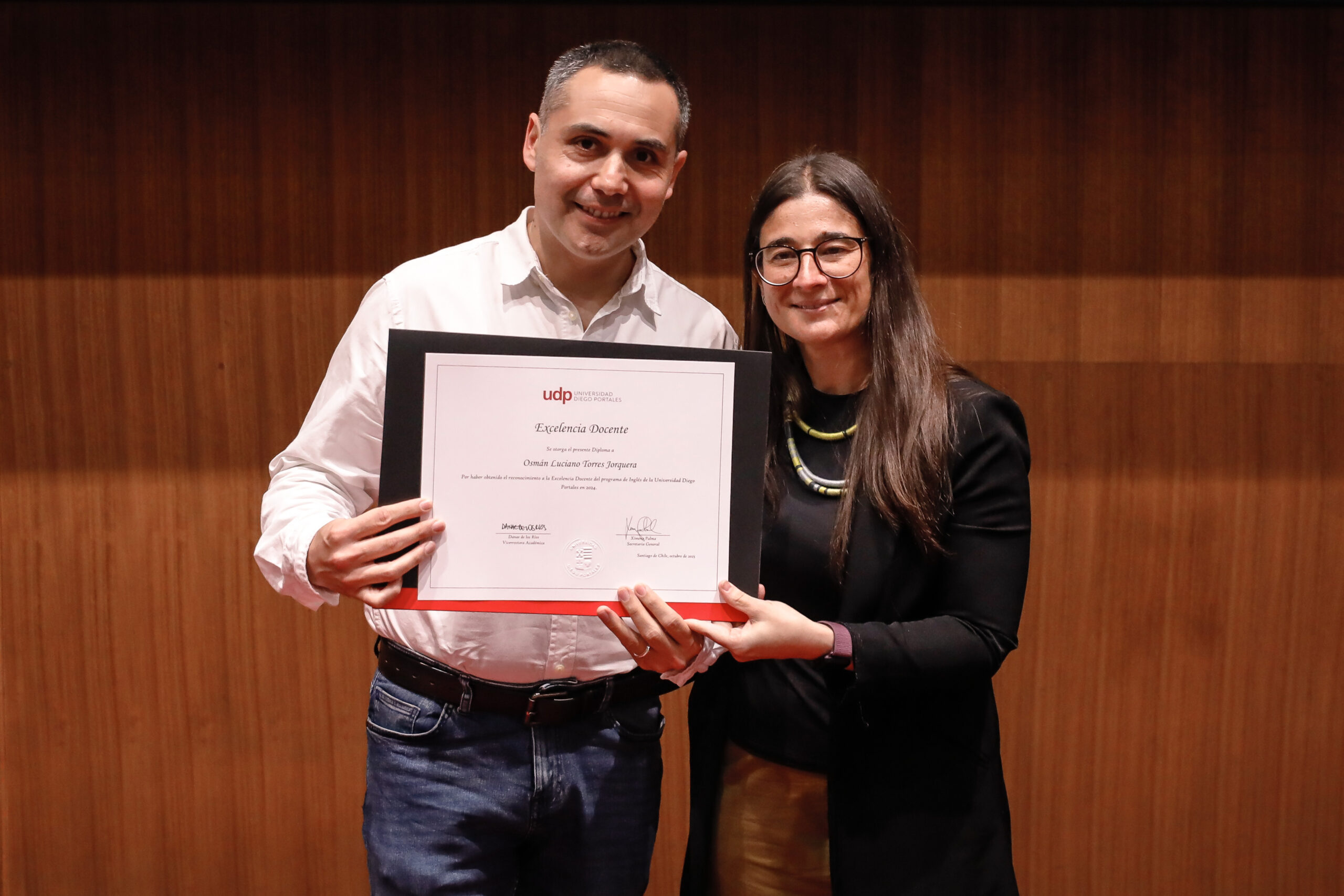 El reconocimiento a la investigación recayó en el académico Patricio Navia, de la Facultad de Ciencias Sociales e Historia, mientras que el premio a la Innovación fue para Jessica Bravo, de la Facultad de Medicina.