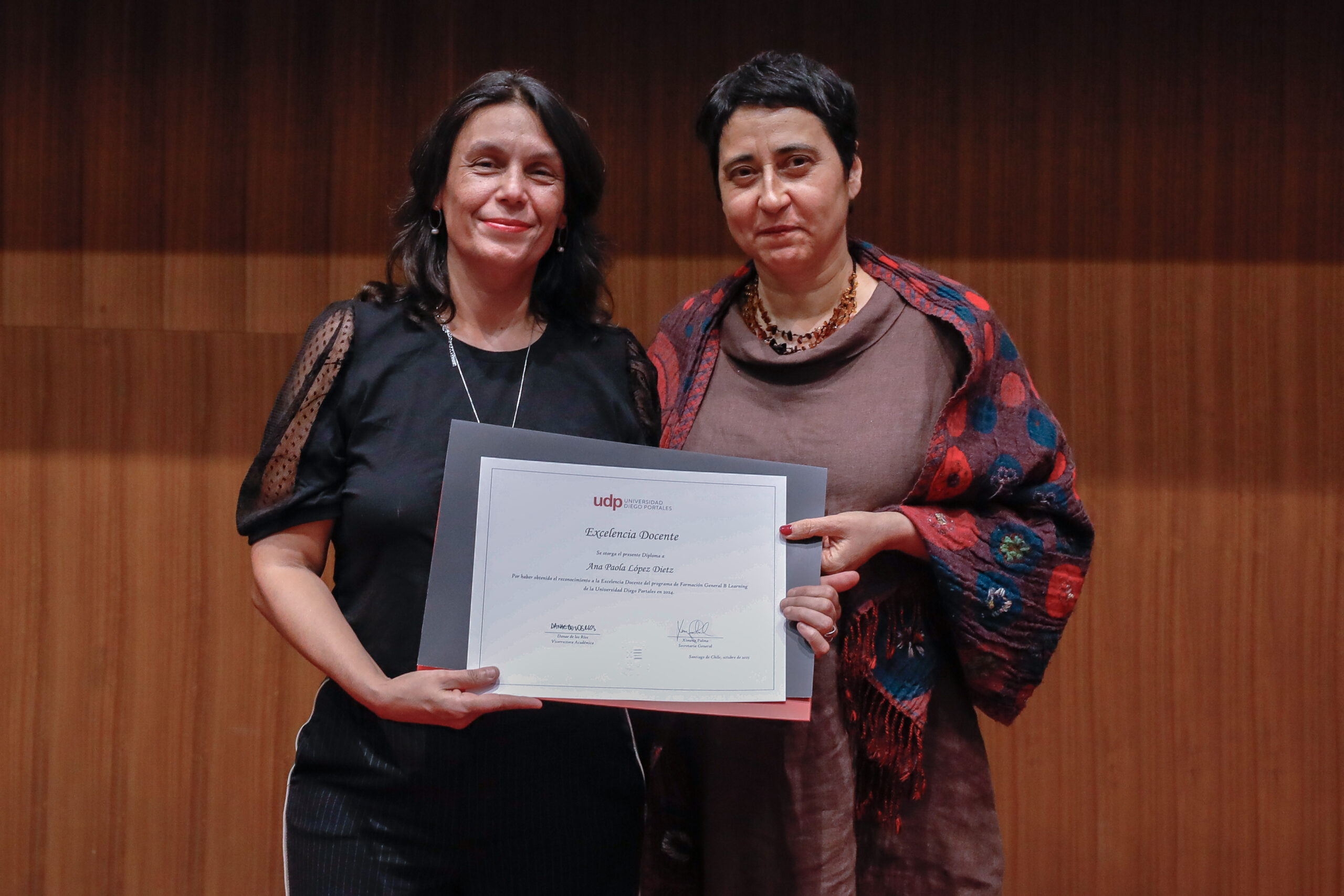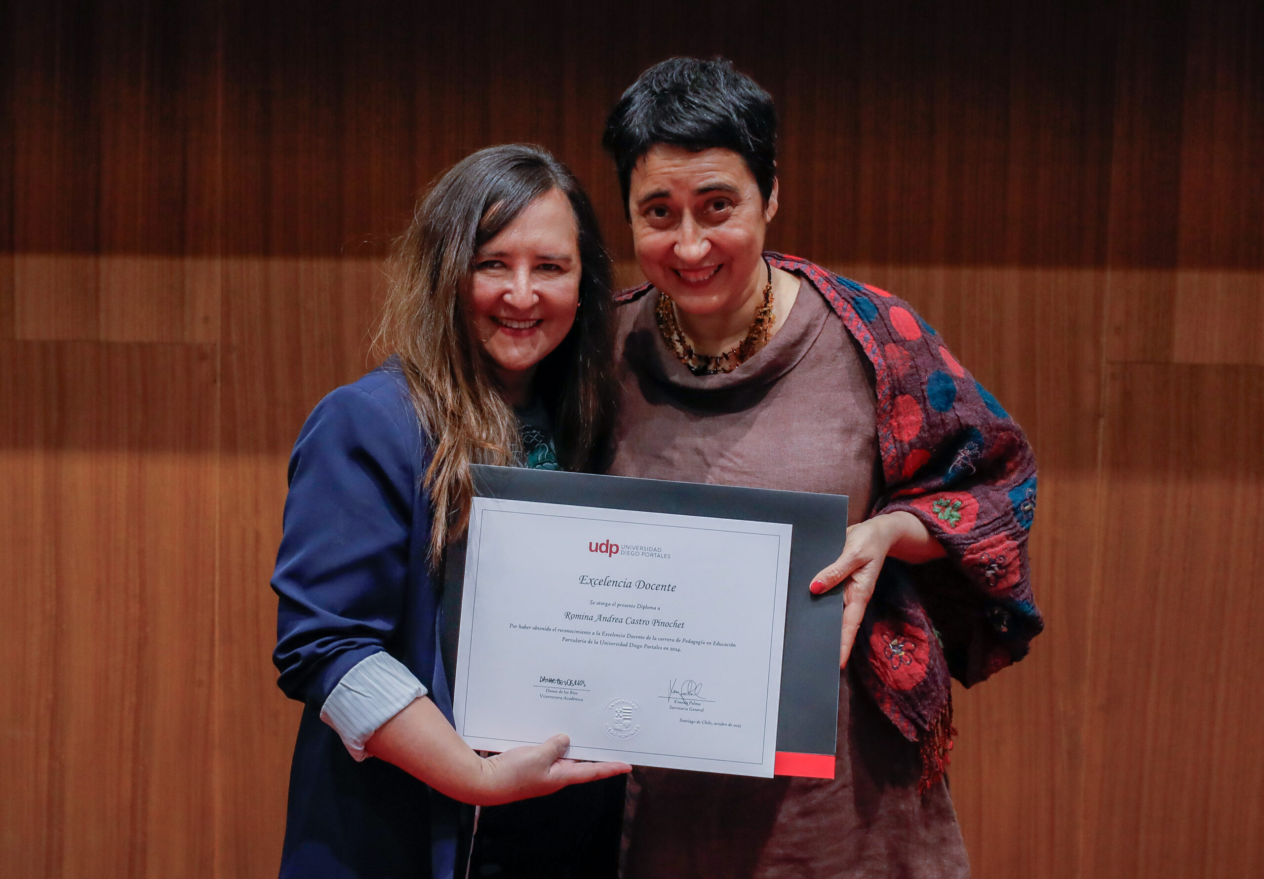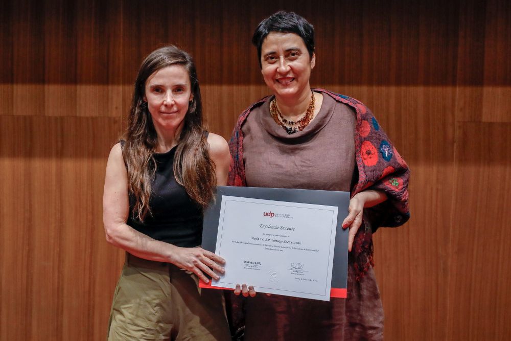 A modo de cierre, se realizó la entrega del Premio Alumni UDP, que en esta ocasión fue otorgado a cinco tituladas. Destacando trayectorias en diferentes ámbitos del conocimiento y el quehacer laboral, tales como la literatura, el cambio climático, las políticas públicas vinculadas a los derechos de las mujeres y la niñez, ecommerce, mentoría y transformación digital, fueron premiadas: Andrea Halabi (Ingeniería Civil Industrial, 2003), Carmen Luz Gillmore Carmona (Ingeniería Civil Informática, 1996), Esperanza Cueto Plaza (Derecho, 1994), María José Ferrada Lefenda (Periodismo, 2001) y María Verónica Celis Vergara (Arquitectura, 2014).