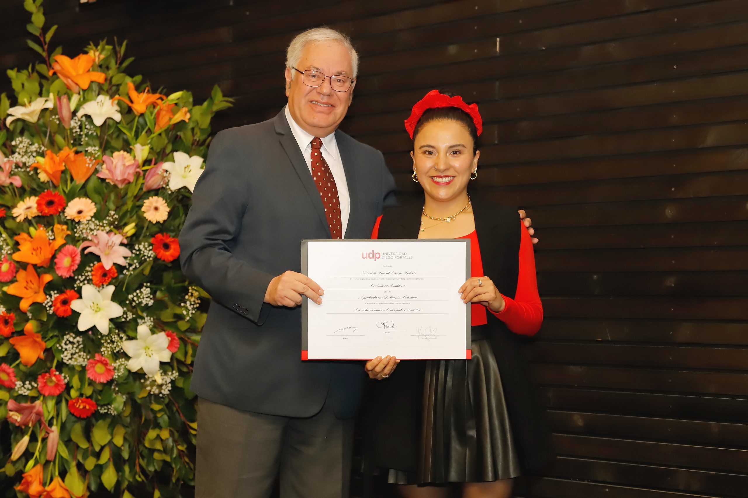 Nayareth concluyó con un poderoso mensaje a sus compañeros, subrayando la importancia de la ética y la integridad en su futuro como contadores auditores, destacando que el verdadero valor de su profesión reside en contribuir al bienestar de la sociedad. En la ocasión, estuvo presente como autoridad máxima el director general de Escuelas Vespertinas, Rodrigo Palacios, además de la plana directiva de la Escuela de Administración y Negocios de la UDP.