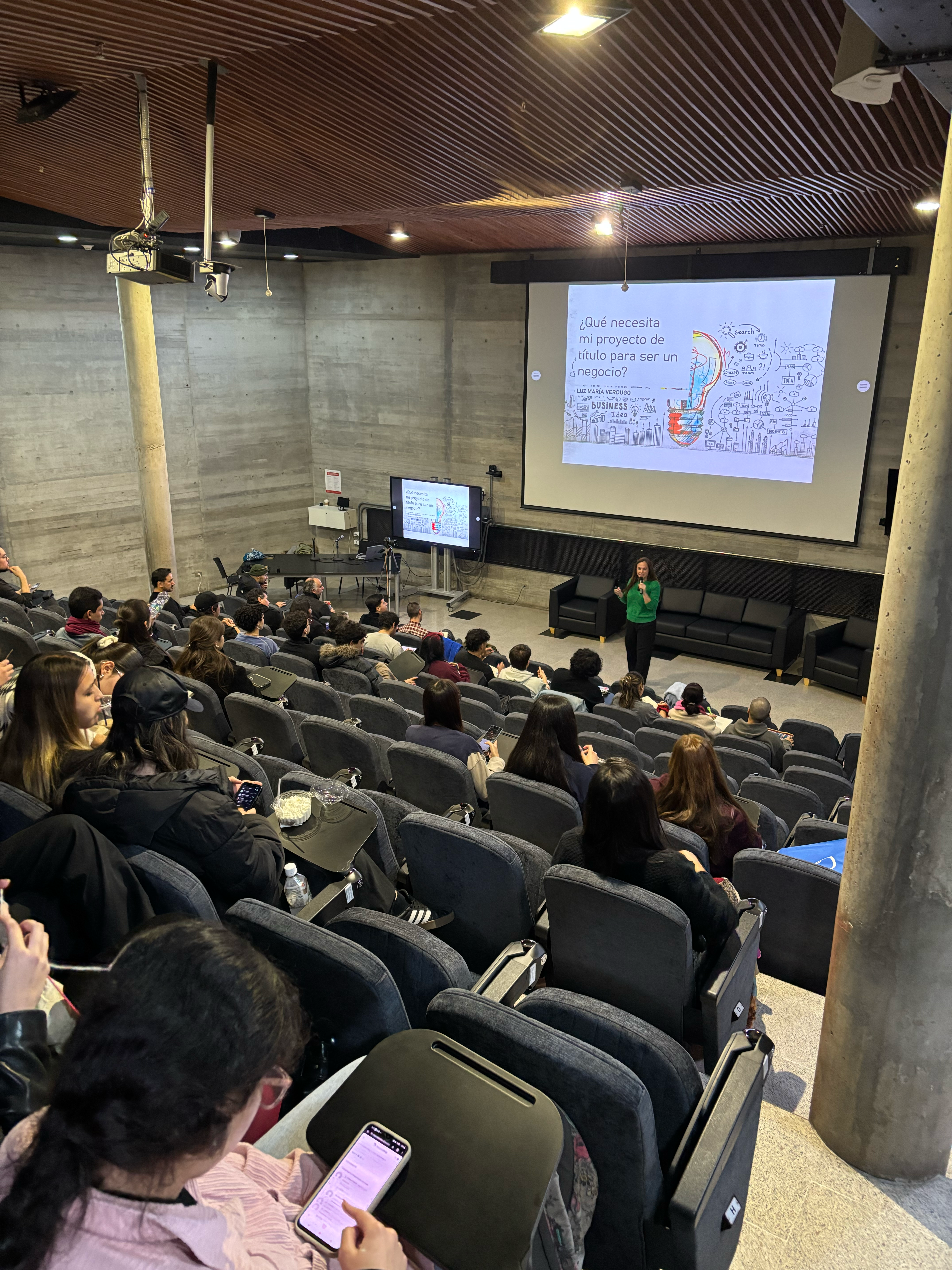 La primera sesión, titulada “¿Qué necesita mi proyecto de título para ser un negocio?”, fue dictada por Luz María Verdugo, fundadora de Innovatorium, quien compartió su experiencia en emprendimiento e innovación.